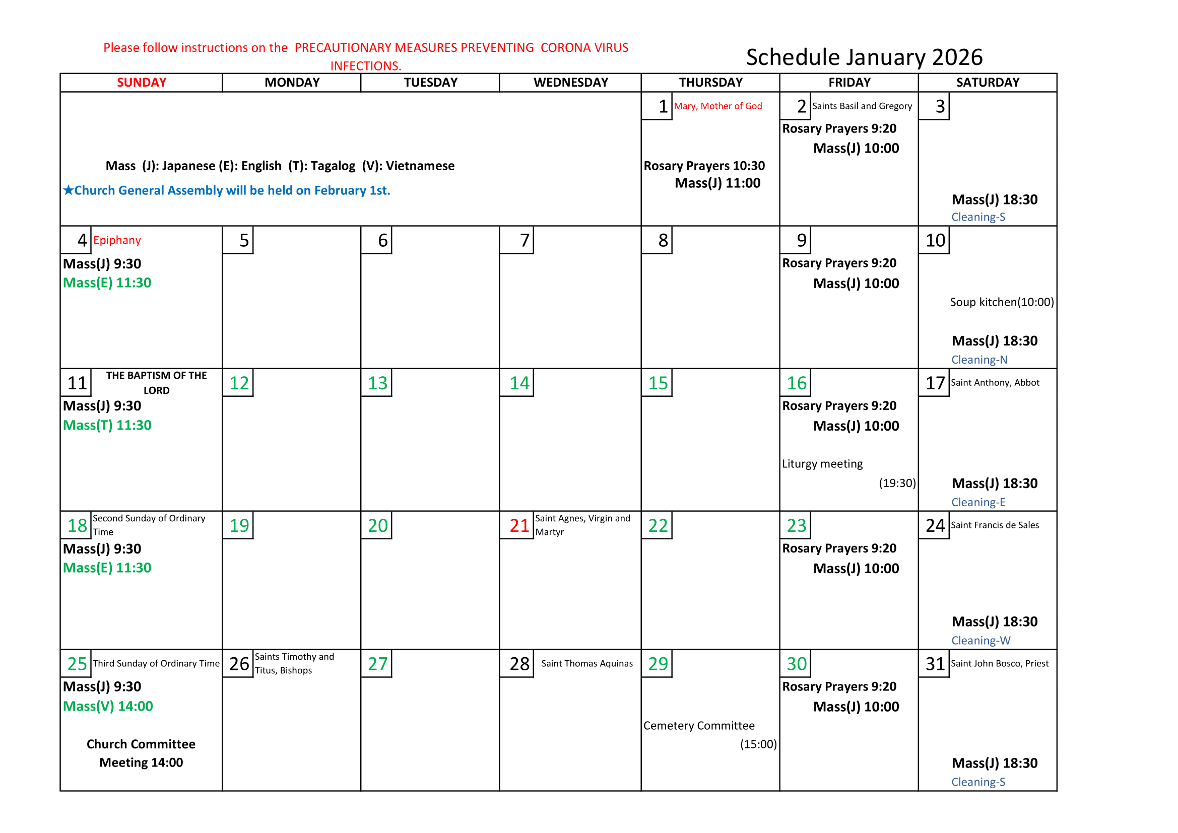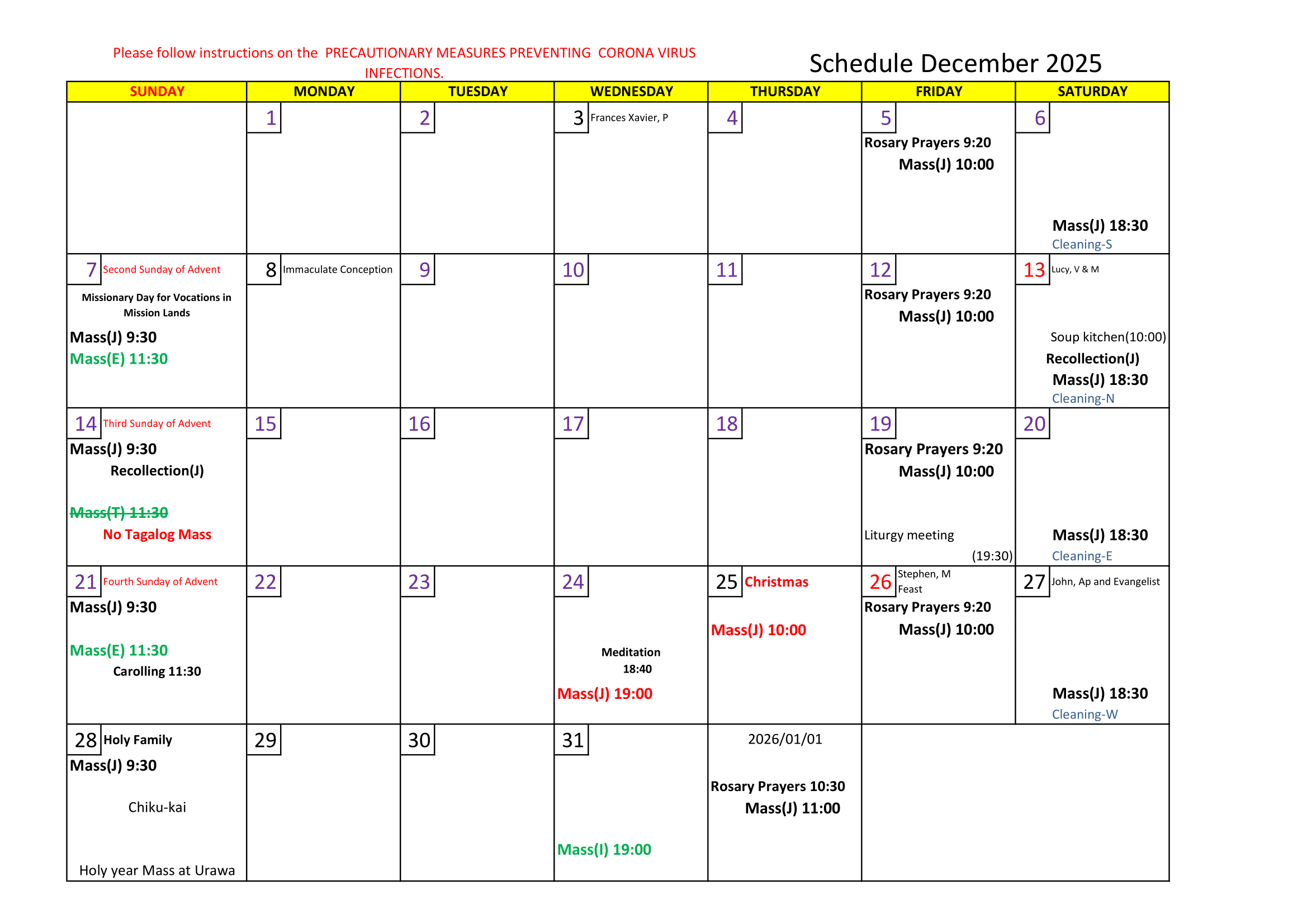 *Please refer to Schedule for this month. Mass schedule is subject to change.